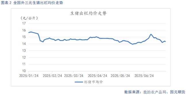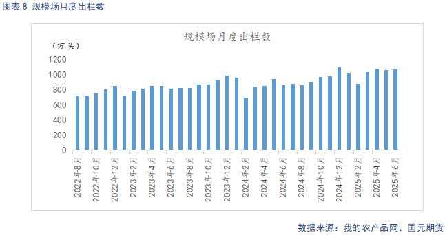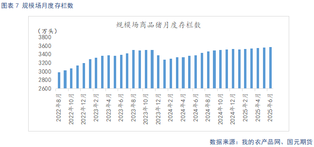 据Mysteel统计,截至2025年6月底,样本规模场能繁母猪存栏量为509.82万头,环比上调0.29%,同比增长4.2%。养殖有一定利润空间,尤其是6月下旬猪价迎来低位反弹,养殖利润走扩,去产能意愿不强,加之对市场存看涨预期,能繁母猪存栏延续增长趋势,从生产周期推算,2025年规模场理论产能呈现环比上升态势。样本规模场6月商品猪存栏数为3574.72万头,环比增加0.3%,同比增加5.63%。样本规模场6月商品猪出栏量为1076.82万头,环比增加1.6%,同比增加23.6%。6月,气温逐步升高,大猪出栏节奏加快。随着大猪存栏下降,7月初养殖端压栏、二育情绪升温,截留部分标猪猪源,出栏节奏放缓,支撑猪价走强。猪价上行后,养殖端认卖心态渐强,出栏节奏有所恢复。近期随着猪价再度走弱,缩量挺价情绪渐起,供给有所缩量。