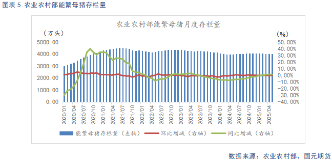 根据农业农村部数据显示,2025年5月末全国能繁母猪存栏量4042万头,同比上升1.2%,环比回升0.1%,根据农业农村部新修正的《生猪产能调控实施方案》,当前能繁存栏相当于正常保有量的103.6%,处于合理区间上限。24年12月至25年5月期间,环比趋稳、同比增幅有限,表明产能扩张势头已有所控制,后续仍需持续观察。不过24年4月至24年11月,能繁母猪存栏逐月环比回升,以生产周期推算,25年前三季度处于产能兑现期。
