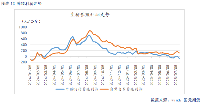 截至7月18日,自繁自养养殖盈利114.86元/头,盈利较上周环比下降45.44元/头。外购仔猪养殖亏损71.84元/头,盈利较上周环比缩小72.01元/头。由于2025年一季度仔猪价格迎来大幅上行,仔猪补栏成本较高,当前外购仔猪养殖的利润空间被压缩。7月初,猪价走势偏强,养殖利润持续回升。不过随着近期供给逐步恢复,猪价回调,养殖利润将有所回落。但规模场自繁自养仍有一定利润空间。