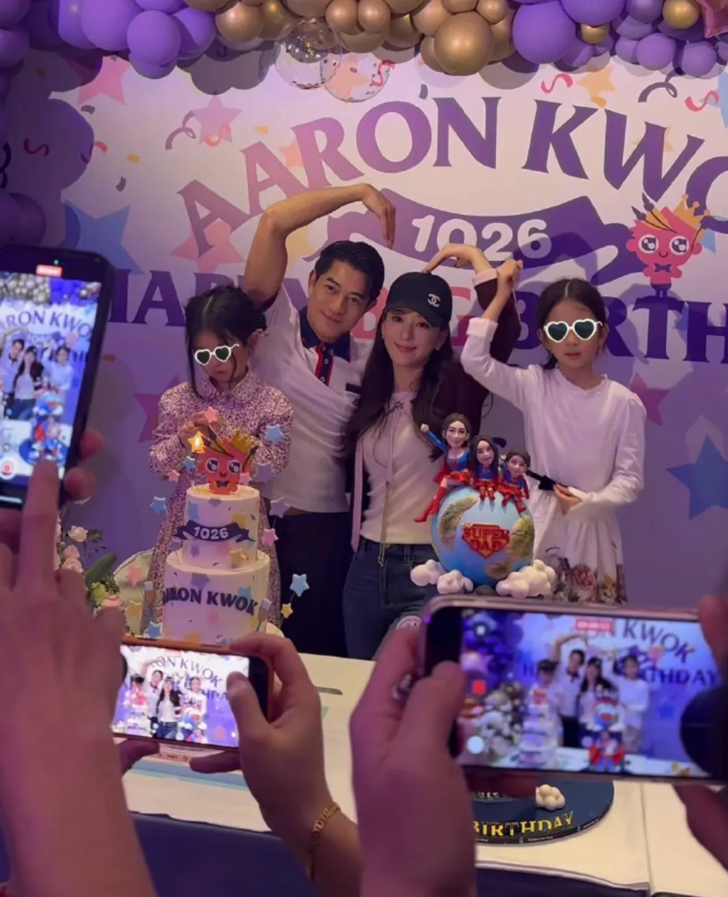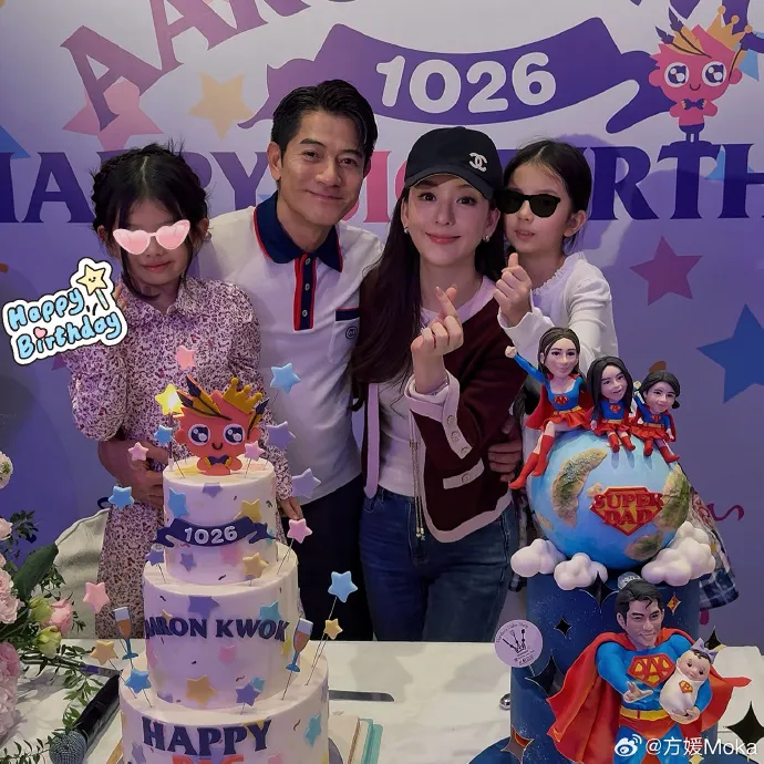 照片中,方媛状态大好,和郭富城甜蜜比心。生日蛋糕上,一家人化身超人形象,郭富城抱着刚出生的三女儿。