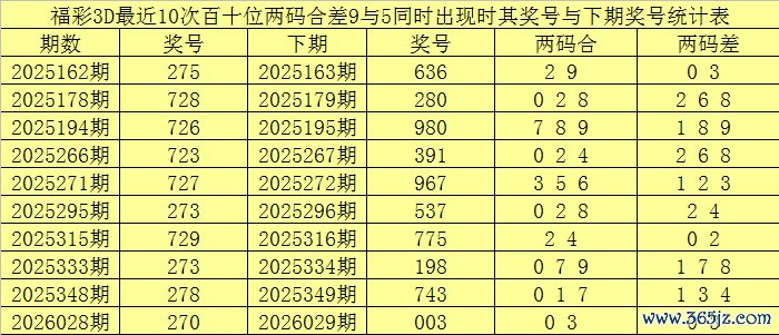 百个位合差分析:上期奖号百个位开出27组合,两码合为9,两码差为5,最近10次百个位两码合9与两码差5同时出现时,其奖号和下期奖号分别为: