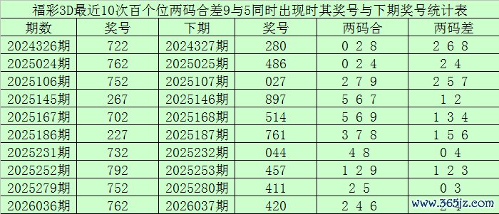 从以上统计可以看出,百十位两码合差9与5同时出现之后其下期两码合差表现最热的4个分别为:0238,本期百十位两码合差可以参考这四码中的数据。