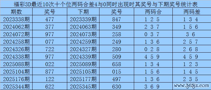 从以上统计可以看出,十个位两码合差4与0同时出现之后其下期两码合差表现最热的4个分别为:1356,本期十个位两码合差可以参考这四码中的数据。