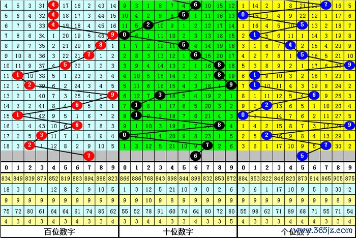 从以上统计可以看出,百个位两码合差9与5同时出现之后其下期两码合差表现最热的4个分别为:1245,本期百个位两码合差可以参考这四码中的数据。