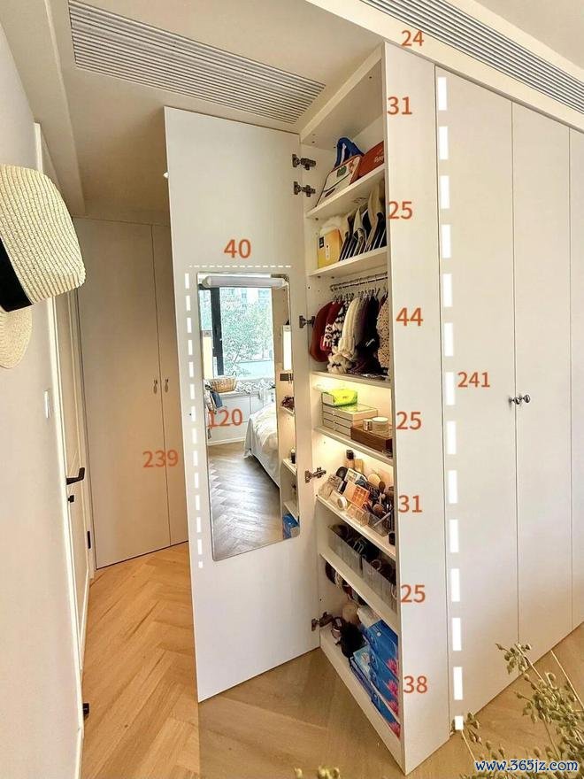 深度做到20cm,就已经能满足大多物品的收纳了,甚至还能当化妆区用,而且只占用了一点点衣柜空间,非常划算。