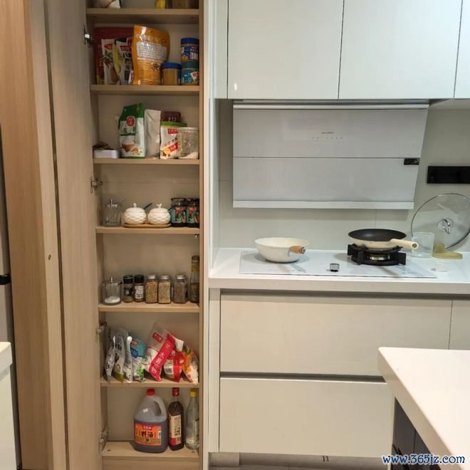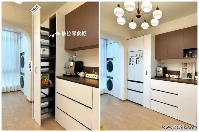 若家里设计了嵌入式冰箱柜,尽量在旁边再设计一个抽拉式零食柜,宽度有个30cm就够,生活动线会十分合理,比较适合吃货。