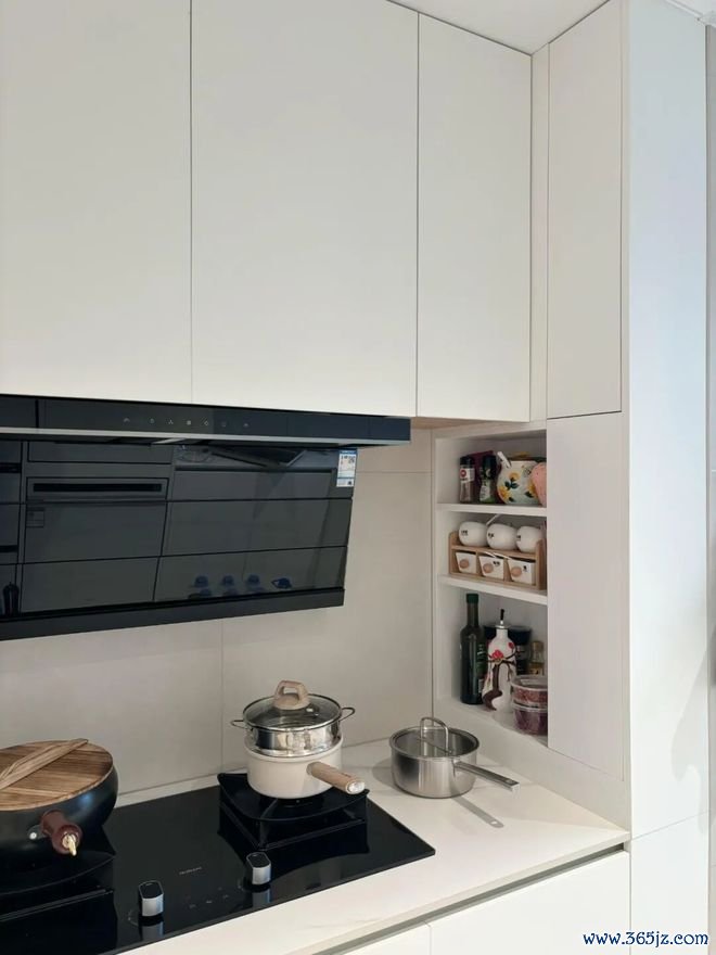 厨房烟道确实让人头疼,可若将其设计成薄柜,并与橱柜整齐划一,那就完全不一样了。