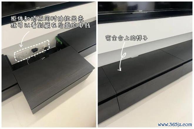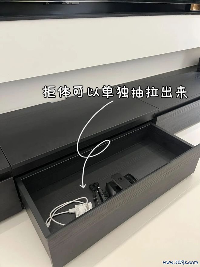 若家里安装了落地式电视柜,中间插座位置的柜体台面,可以设计成抽拉式结构,方便插拔电器,让电线完全隐形。