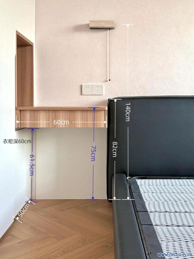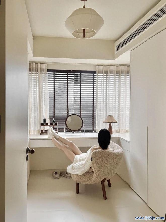 同样的设计思路,还可以用在床头一侧的一体式梳妆台下方。
