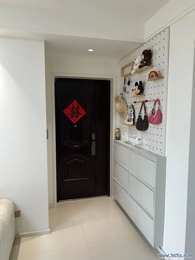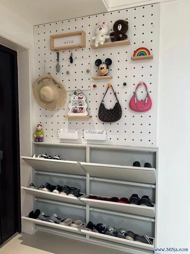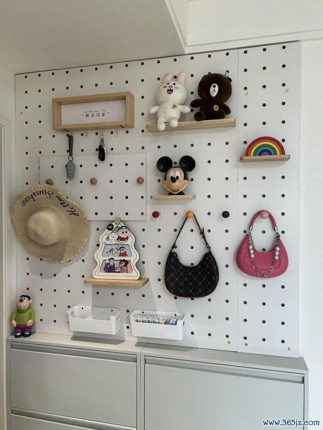 另外,鞋柜上方还可以设计一面洞洞板。包包、帽子、钥匙等一些物品,想挂就挂,拿取也方便。