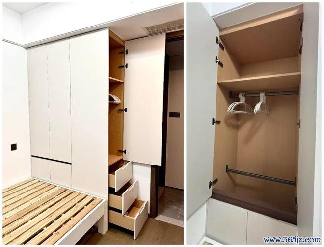 若房间设计了一体式榻榻米,可以在衣柜侧面做一个深抽,解决底部空间不好使用的痛点。
