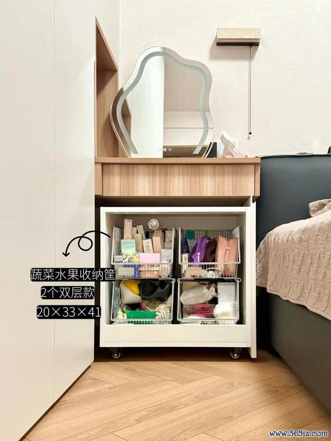 推进去,不影响坐着化妆放脚;拉出来,既是一个超能装的柜子,又可以当成化妆凳用,而且不影响地面卫生清洁。