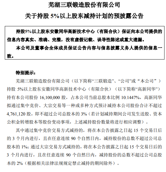 三联锻造:持股5%以上股东拟减持不超过3%公司股份三联锻造:持股5%以上股东拟减持不超过3%公司股份