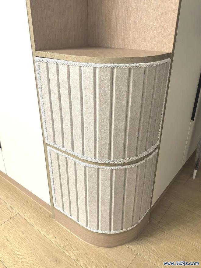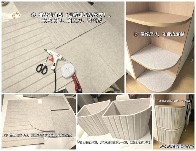 邪修思路:网购9mm厚毛毡板,按照转角隔层尺寸裁剪一下,用热熔胶拼接起来,再贴个蕾丝带装饰一下,就是一个美观的收纳盒了。