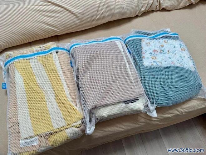 另外,家里如果有多余的洗衣袋,用它来收纳四件套也很方便,一个袋子装一套,拉链一拉就完事。