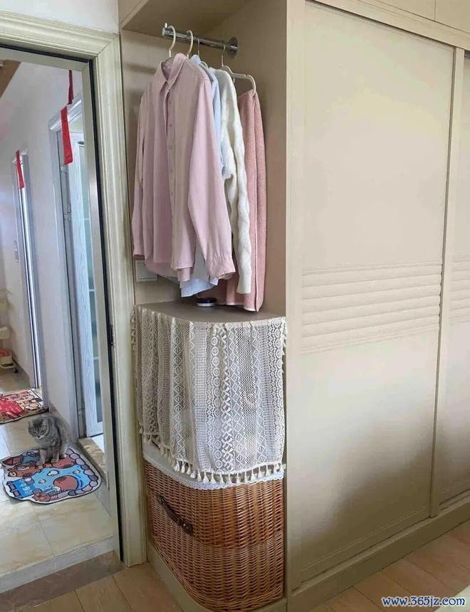 另外,你也可以采用拆隔板+布帘+藤编框,将其设计成一块次净衣收纳区,实用性更强,但也稍微麻烦一些。
