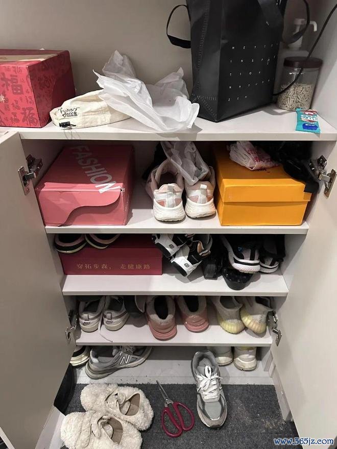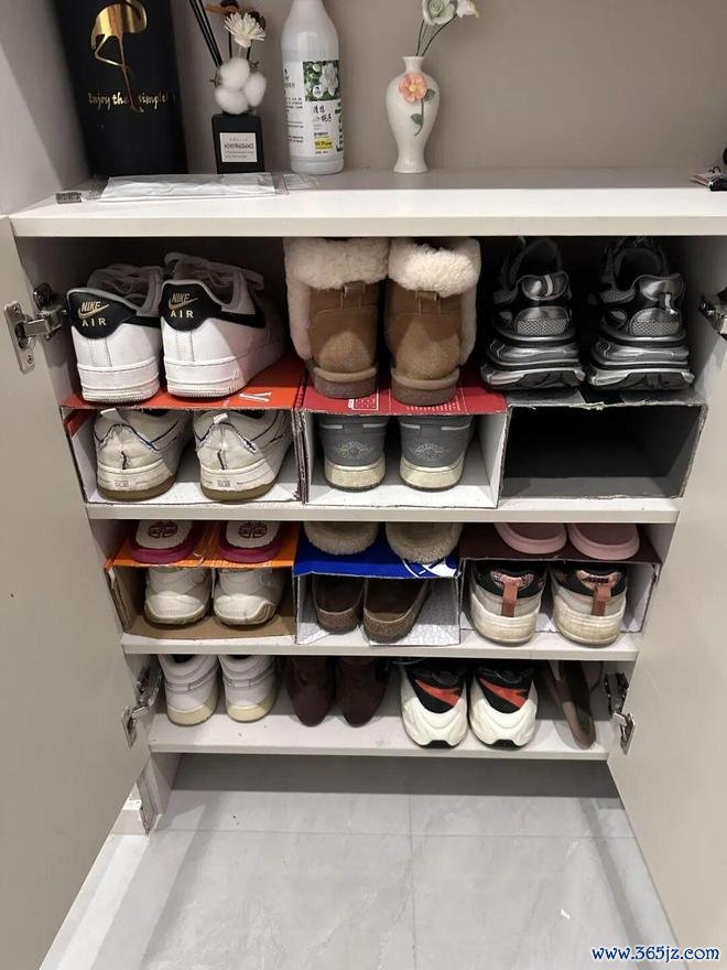 虽然看着不太美观,但柜门一关啥都看不见,而且还让那些舍不得扔的鞋盒物尽其用了。