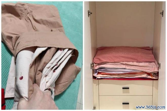 邪修思路:把床头和被套叠好,抓起来塞进枕套里,再稍微往整理一下放衣柜里,既整齐又不会散开,一拿就是一套,而且看枕套就能分辨。