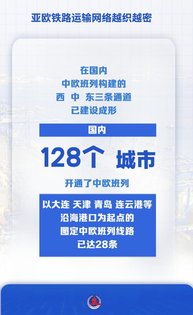 在国内,中欧班列构建的西、中、东三条通道已建设成形,国内128个城市开通了中欧班列,以大连、天津、青岛、连云港等沿海港口为起点的图定中欧班列线路已达28条。