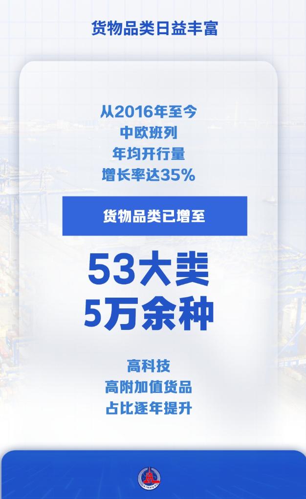从2016年至今,中欧班列年均开行量增长率达35%,货物品类已增至53大类5万余种,高科技、高附加值货品占比逐年提升。