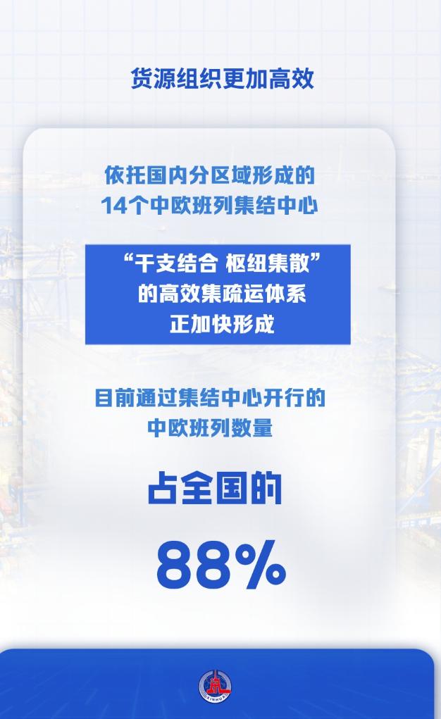 依托国内分区域形成的14个中欧班列集结中心,“干支结合、枢纽集散”的高效集疏运体系正加快形成,目前通过集结中心开行的中欧班列数量占全国的88%。