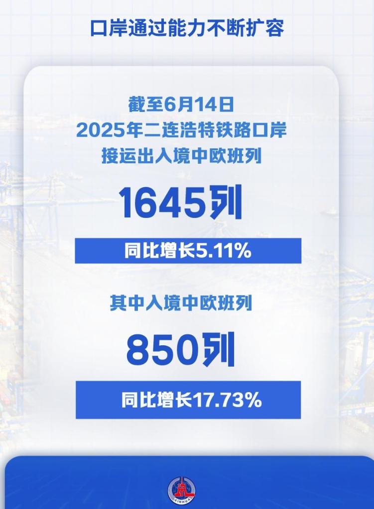 二连浩特口岸是中欧班列中通道进出境的唯一铁路口岸,截至6月14日,2025年二连浩特铁路口岸接运出入境中欧班列1645列,同比增长5.11%,其中入境中欧班列850列,同比增长17.73%。