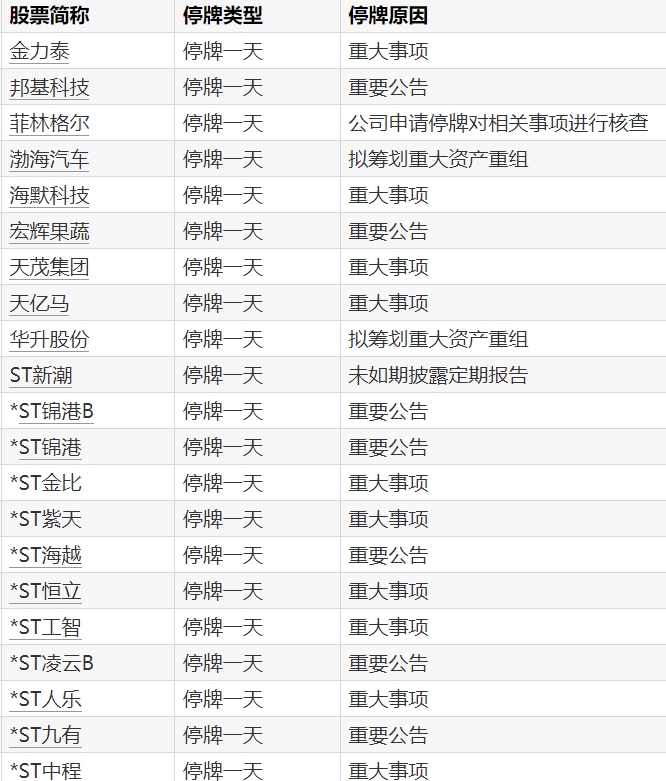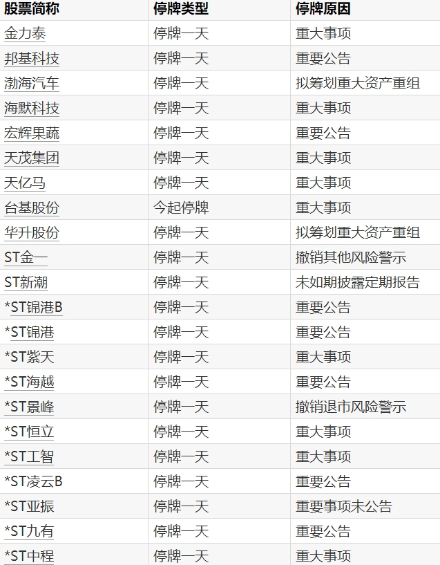 A股停牌提示:21股今日停牌A股停牌提示:21股今日停牌