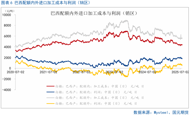进口量:中性。7月预计能进口75万吨的白糖,随后8月开始进口量逐渐下降,之前下跌的最低点大概也交易完毕这个预期。