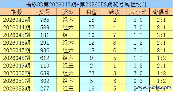 开奖回顾:福彩3D第2026052期开出奖号277。奖号形态为组三,奇偶比为2:1,012路比为0:2:1,大小比为2:1,和值为16,跨度为5。